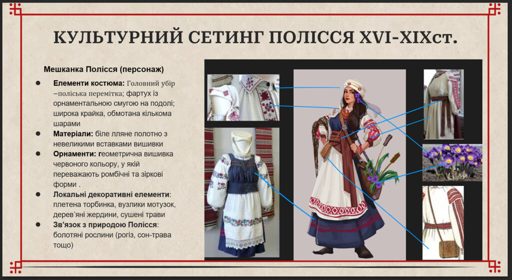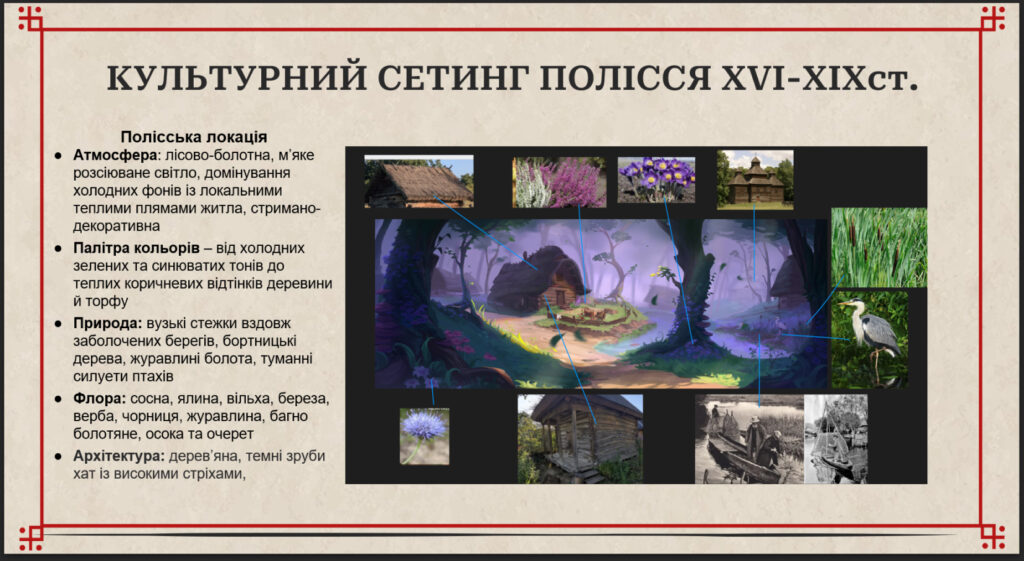 Представлена на конкурс робота містила цілий комплекс досліджень: бібліографічний і культурологічний аналіз, системно-інформаційний, візуально-аналітичний та образно-асоціативний методи. Етнографічне дослідження, проведене Михайлом в Національному музеї народної архітектури та побуту України, дозволило зібрати й систематизувати значну кількість візуальних референсів архітектури, костюма, побутових предметів, природних ландшафтів та декоративних елементів, на основі яких було розроблено дизайн середовища і персонажа Полісся для відеогри.