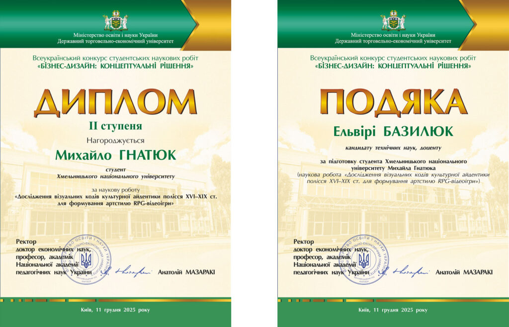 11 грудня 2025 року магістрант 2-го курсу Михайло Гнатюк здобув 2 місце в фіналі Всеукраїнського конкурсу студентських наукових робіт «Бізнес-дизайн: концептуальні рішення», який проводився Державним торгівельно-економічним університетом. До уваги журі в номінації «Візуальні концепції в дизайні: теоретичні дослідження» була представлене його науково-творча робота «ДОСЛІДЖЕННЯ ВІЗУАЛЬНИХ КОДІВ КУЛЬТУРНОЇ АЙДЕНТИКИ ПОЛІССЯ XVI–XIX СТ. ДЛЯ ФОРМУВАННЯ АРТСТИЛЮ RPG-ВІДЕОГРИ» (керівник канд.техн. наук, доцент Ельвіра БАЗИЛЮК). Дослідження проводилось в рамках виконання магістерської кваліфікаційної роботи на тему «Розроблення артстилю відеогри в жанрі RPG з візуалізацією українського культурного сетингу XVІ–XІХ ст. у контексті регіональних традицій Поділля, Полісся та Закарпаття».